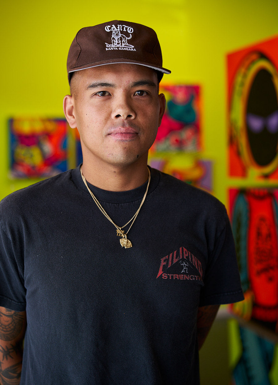 D.J. Javier is a Santa Barbara-based Filipino-American artist whose dynamic work spans across fine art, graphic design, large scale murals and consumer goods. His body of work is a vibrant testament to his cultural heritage, personal experiences and the countercultural landscapes of Southern California. Javier’s art is recognized for its unique blend of bold silhouettes and bright colors, often featuring motifs that explore his cultural identity as a first-generation Filipino American reflecting a deeper engagement with his roots.