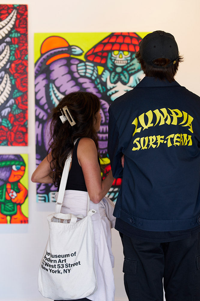 Javier has painted multi-story large scale murals across the US in cities including New York City, Los Angeles, Salt Lake City, San Diego and Santa Barbara. He owns and operates his creative studio, Bayan Surf Club, in Santa Barbara, California and his two brands Canto Vision and Lumpia Surf Team.