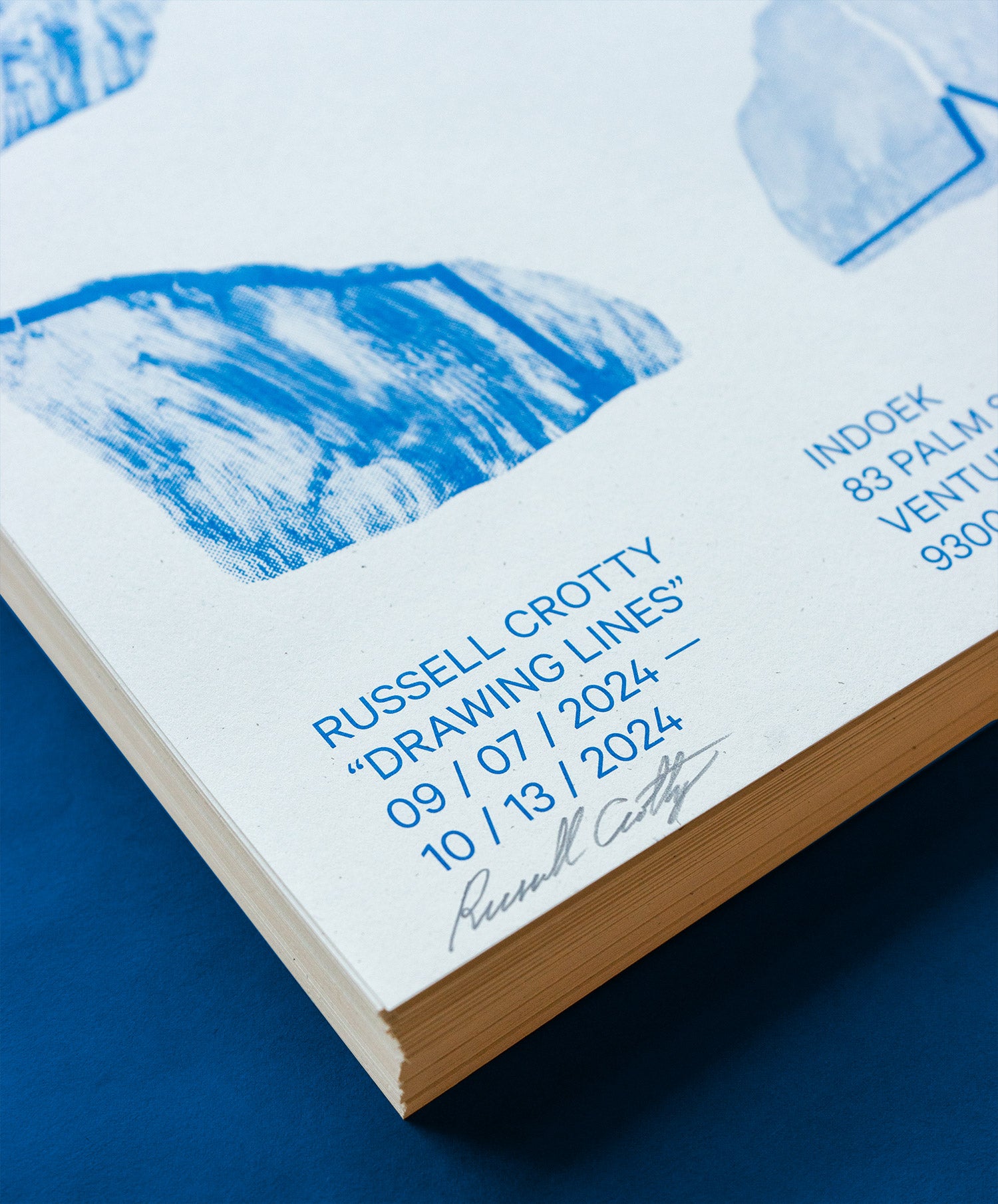 12.5 x 19″ 1-color silkscreen on recycled, natural 100# cover. Signed + numbered dition of 75. Promotional poster for Russell Crotty’s solo exhibit, “Drawing Lines” at Indoek gallery. No returns accepted.